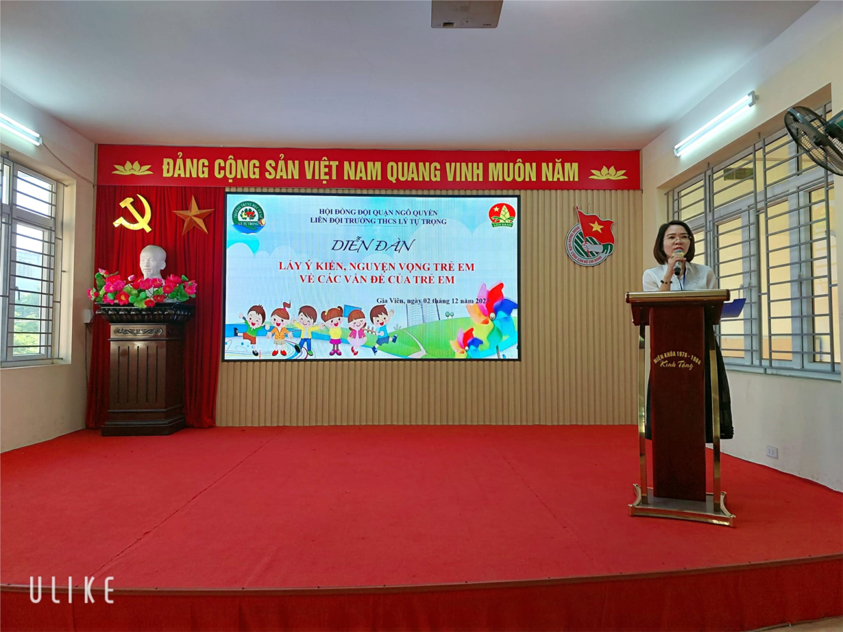 Trong năm học 2023-2024 để phát huy tính dân chủ, tự nguyện, tự quản trong sinh hoạt tập để, đặc biệt là hoạt động lắng nghe ý kiến, nguyện vọng của trẻ em và phát huy quyền tham gia động của trẻ em vào các hoạt động của tổ chức Đội và các vấn đề về trẻ em. Liên đội trường THCS Lý Tự Trọng đã tổ chức 2 buổi trao đổi lấy ý kiến của trẻ em, phát huy quyền tham gia của trẻ em vào các vấn đề về trẻ em . Ban giám hiệu nhà trường đã trực tiếp giải đáp các thắc mắc của các em học sinh đối với các vấn đề liên quan tới Luật trẻ em năm 2016 .