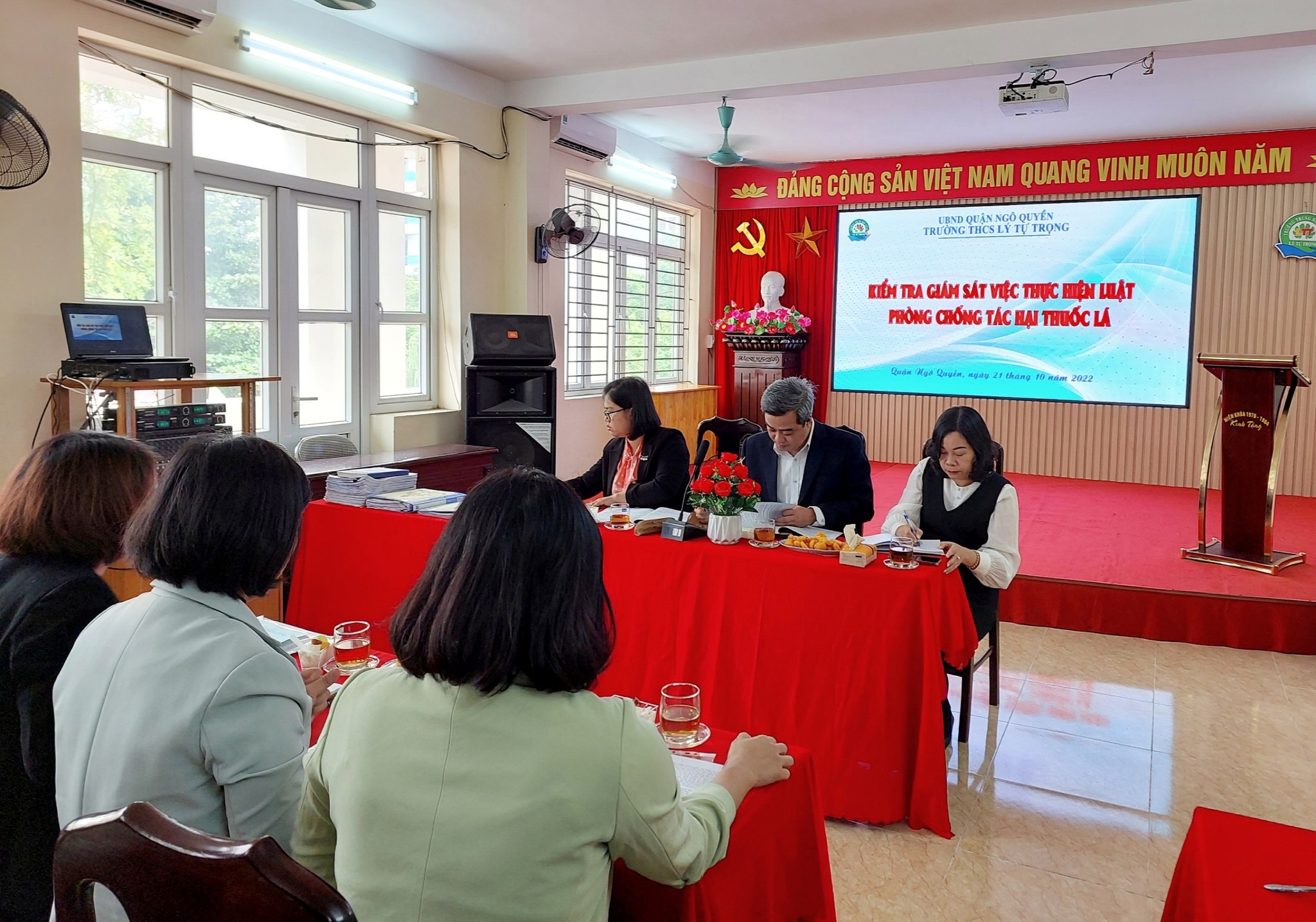 Thực hiện Công văn số 3159//SGDĐT-GDTrH ngày 17 tháng 10 năm 2022 của Sở Giáo dục và Đào tạo (GD&ĐT) thành phố Hải Phòng về việc kiểm tra, giám sát việc thực hiện Luật phòng, chống tác hại thuốc lá; sáng ngày 21/10/2022, tại trường THCS Lý Tự Trọng, Đoàn kiểm tra, giám sát việc thực hiện Luật PC tác hại thuốc lá của Bộ Giáo dục, Sở GD-ĐT Hải Phòng đã có buổi làm việc tại đơn vị.